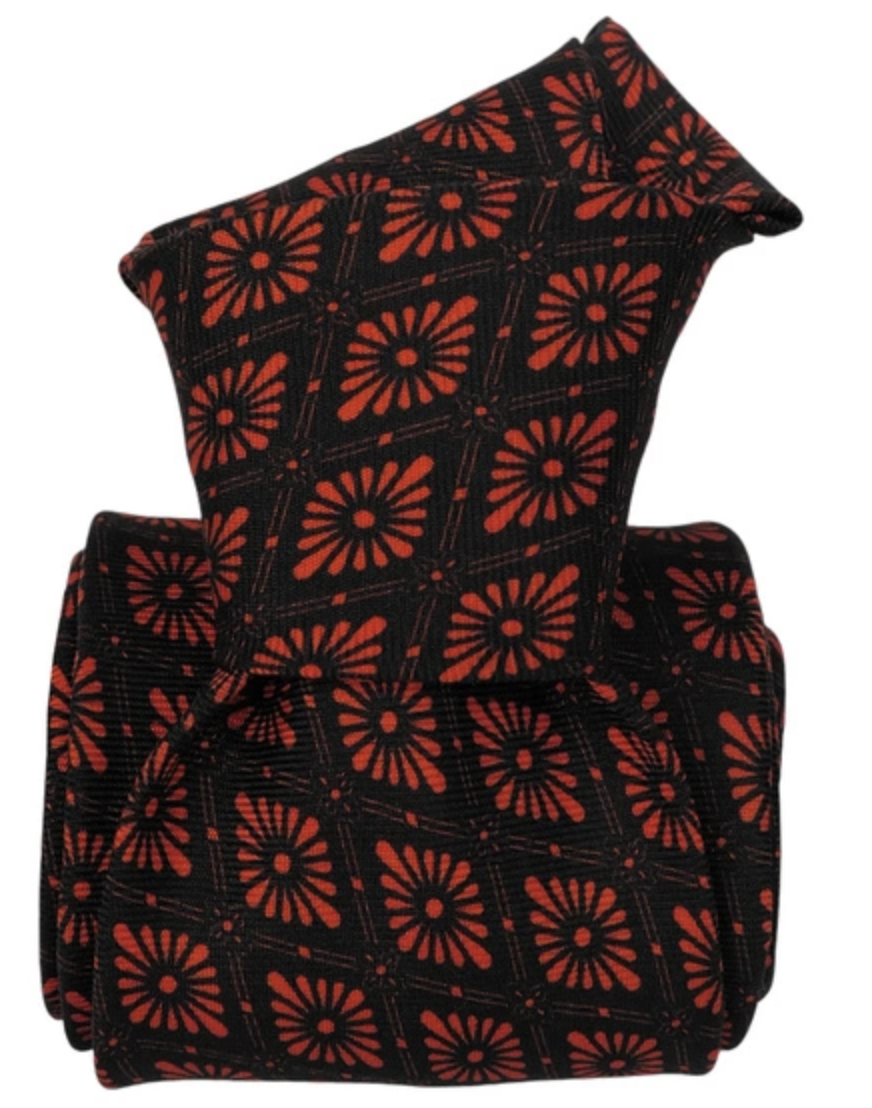 Tło jest czarne, więc świetnie koresponduje z czernią garnituru, a czerwony delikatny wzór dodaje charakteru. Musimy jednak pamiętać, że każdy wzór, dodatkowy kolor do czarnego garnituru może nieco osłabiać efekt elegancji i powagi, więc na najbardziej formalne, poważne okazje polecamy Ci wybrać samą czerń.