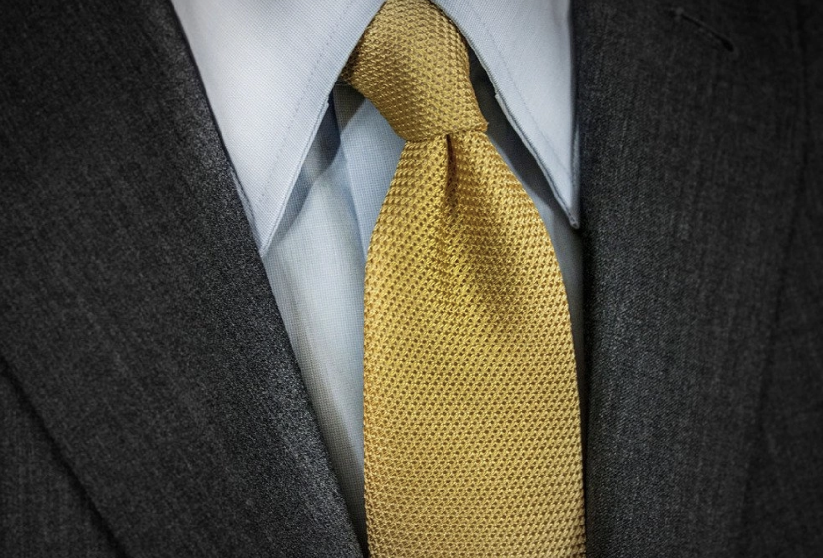 Tylko pamiętaj: idziesz tu w kierunku dandy, a nie bezpiecznej klasyki. Nie każda okazja udźwignie żółty krawat — na kolacji u ambasadora może być już too much. Ale na mniej formalnym przyjęciu? Oryginalnie i nadal elegancko.