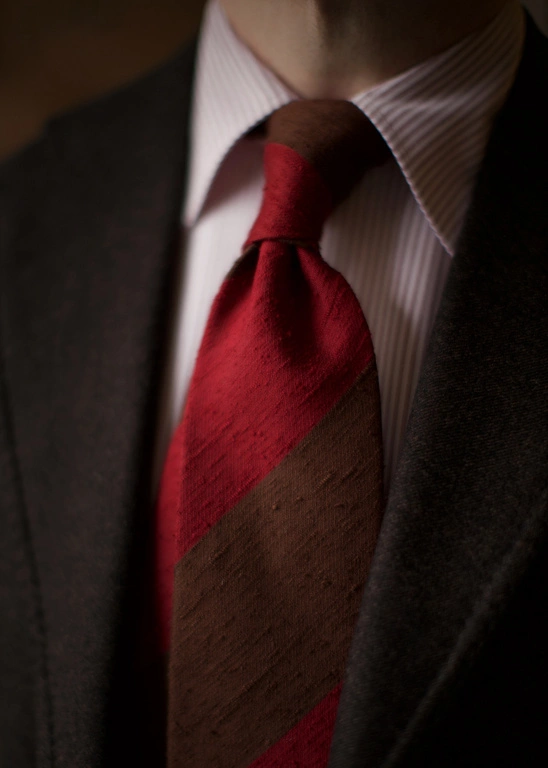 A great way to diversify your wardrobe is to choose a shantung tie. This fabric is rare on a daily basis, and yet it has enjoyed popularity among stylish men for years. Raw silk yarn gives the tie an unusual character. The unique style is complemented by the choice of pattern. Stripes blend in perfectly with the rough texture of the fabric. A shantung tie ideally suits heavier fabrics such as tweed or jeans.
